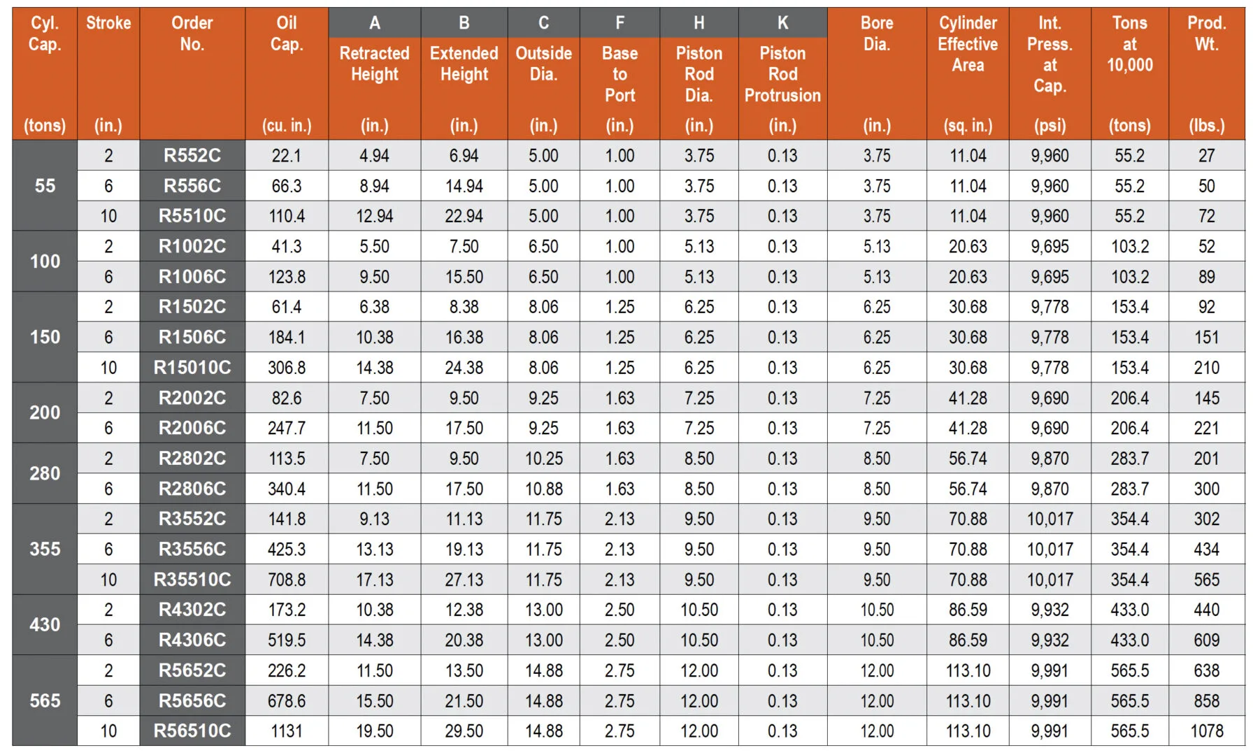The Power Team R2806C is a high-capacity, single-acting hydraulic cylinder engineered for heavy industrial lifting and pressing operations requiring substantial output force and controlled linear displacement. Rated at 280 tons with a 6 in stroke, the cylinder delivers high load stability through a precision-machined steel body and piston assembly designed for 10,000 psi system pressure. The single-acting configuration utilizes hydraulic pressure to extend the piston, while a heavy-duty internal spring handles retraction, reducing circuit complexity and enabling efficient operation in high-tonnage systems. The cylinder’s large bearing surfaces and optimized load path minimize side-load sensitivity and ensure consistent performance under full-rated load conditions.