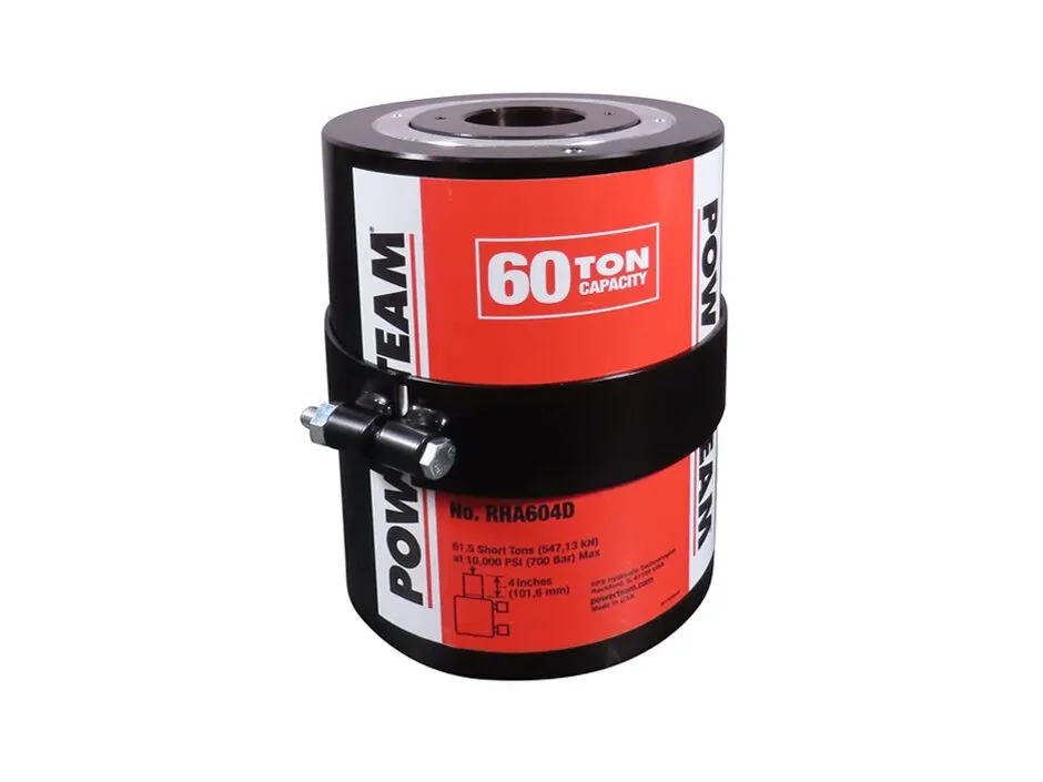 The Power Team RHA306 is a 30-ton, double-acting center-hole hydraulic cylinder engineered for precision pulling, tensioning, and rod-through applications where controlled bidirectional force is required. Its annular design enables direct alignment over studs, cables, or tie-rods, while the double-acting configuration provides positive retraction under load, reducing cycle times and improving operational consistency. The honed steel cylinder body and wear-optimized seals maintain pressure integrity during high-duty cycles and resist deformation under full-capacity compressive loading.